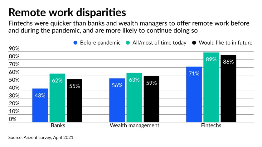 In the future, 55% of the bank respondents said they would like to work from home all or most of the time if their employer offered that option, compared with 86% at fintechs.