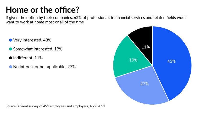 Across all survey respondents, which included professionals in the financial services industry and related fields, 43% said that they were very interested in working from home at least some of the time, and 19% said that they were somewhat interested.